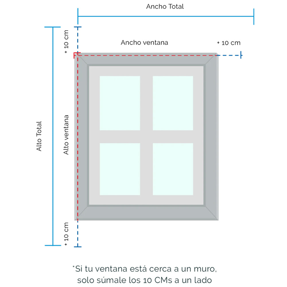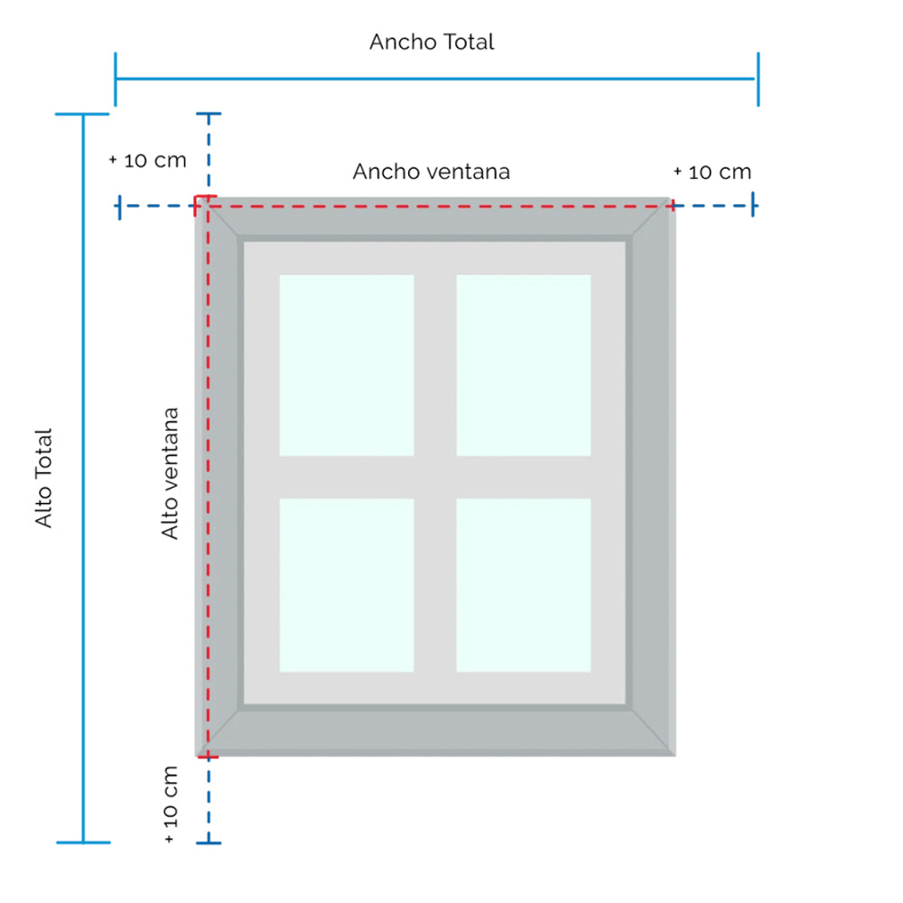 Mide desde la parte superior de la ventana hasta el alféizar. Si es fuera del marco, mide el ancho y alto desde los bordes del marco y agrega 10 cm a cada medida para mayor privacidad y control de la luz.